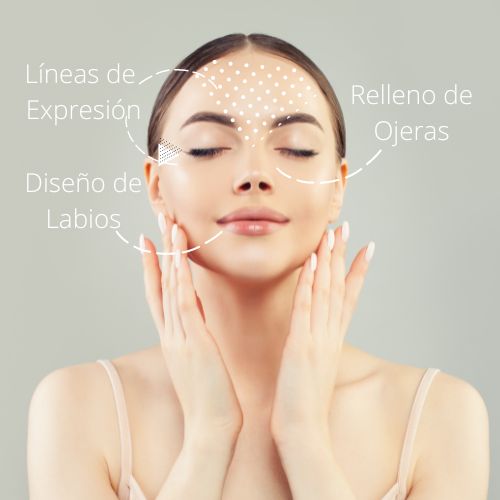 Aplicación de Botox en tercio superior, diseño de labios con ácido hialurónico y aplicación de ácido hialurónico en una zona adicional a elección del paciente.
